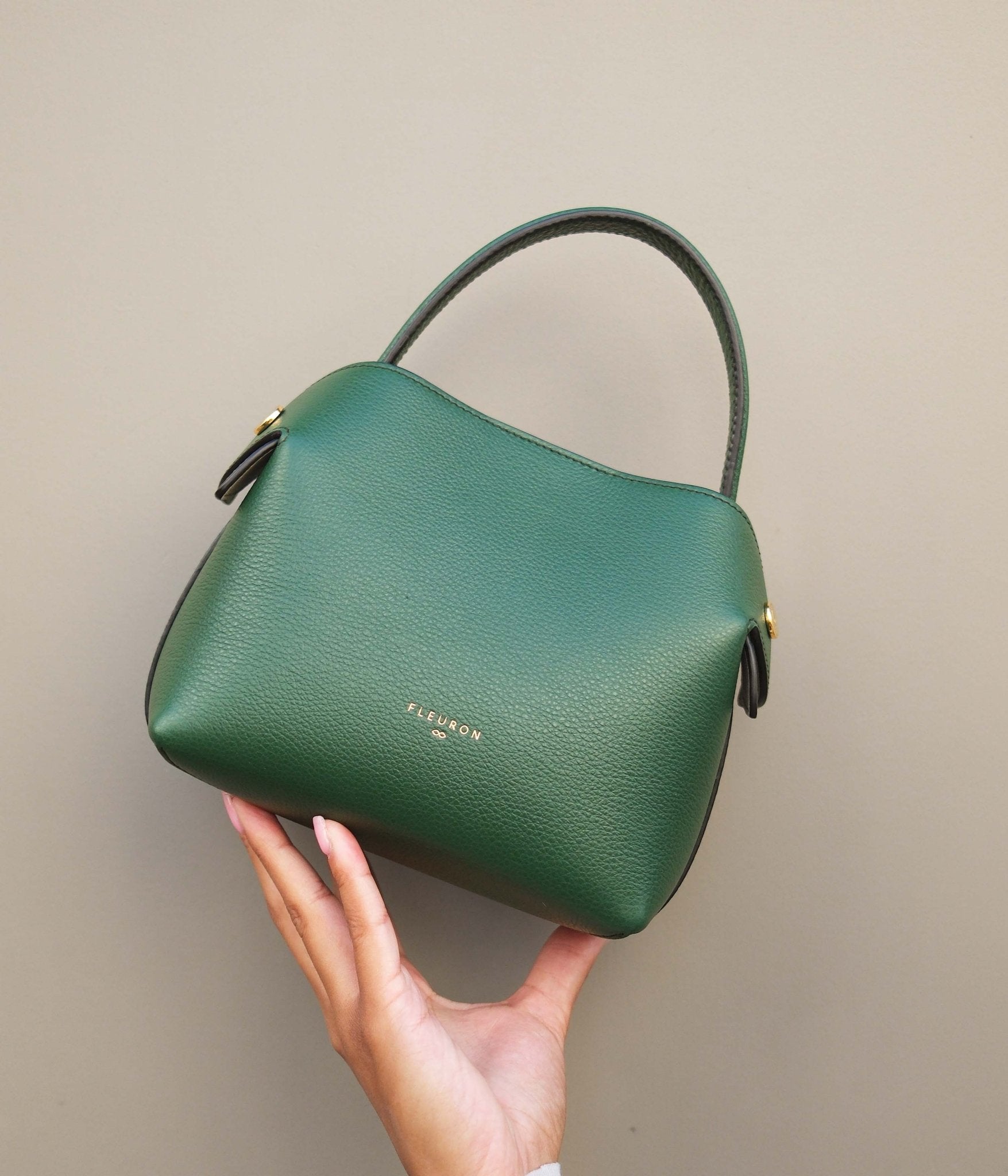 Handcrafted in Italy from grained calfskin, this piece stands out with its refined texture and understated gold accents. The light beige interior creates a soft contrast with the richness of the green, striking the perfect balance between warmth and sophistication.