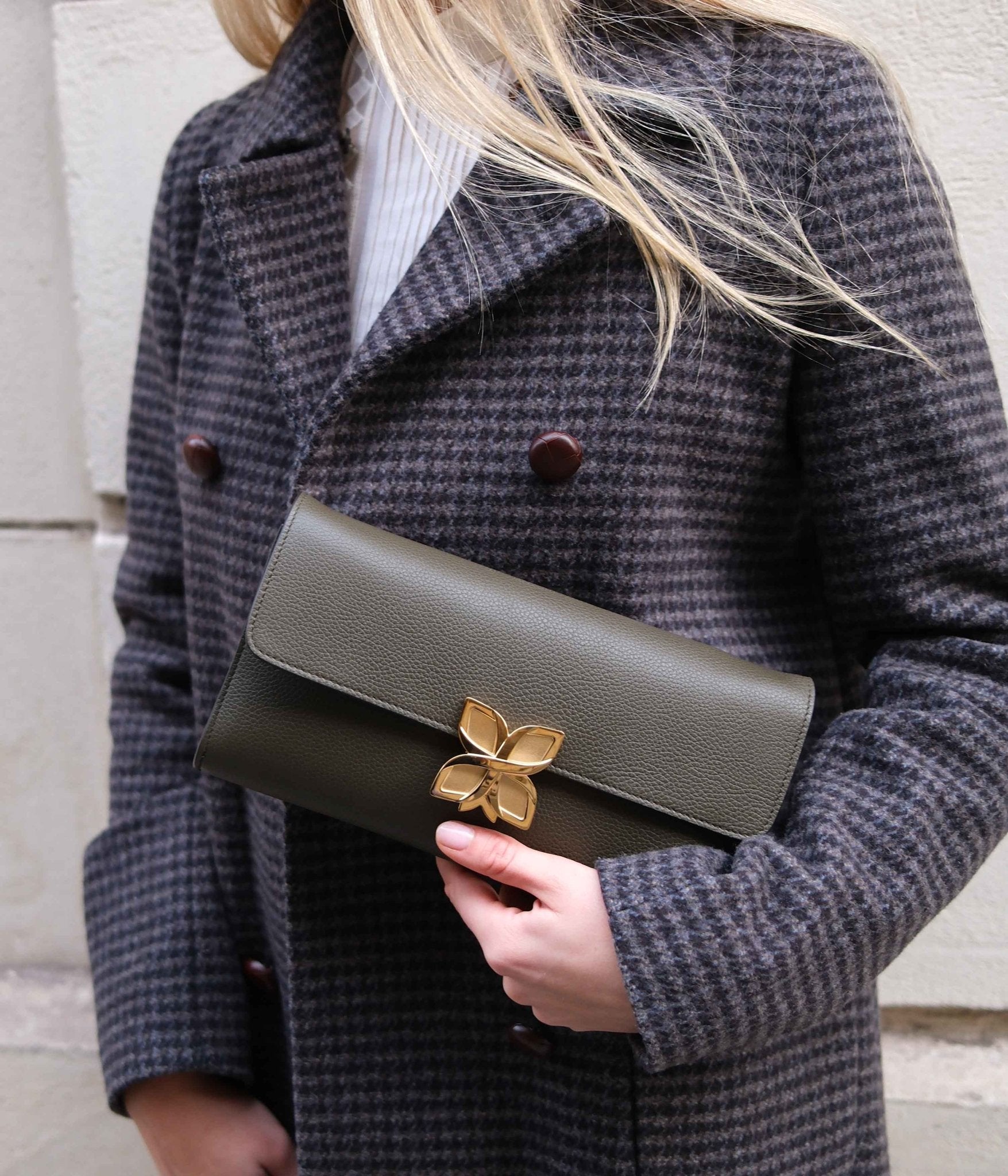 Be inspired by the natural elegance of the Hortensia Clutch in grained calf leather Vert Olive.