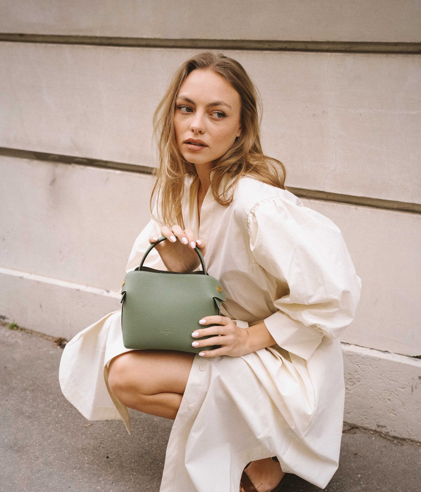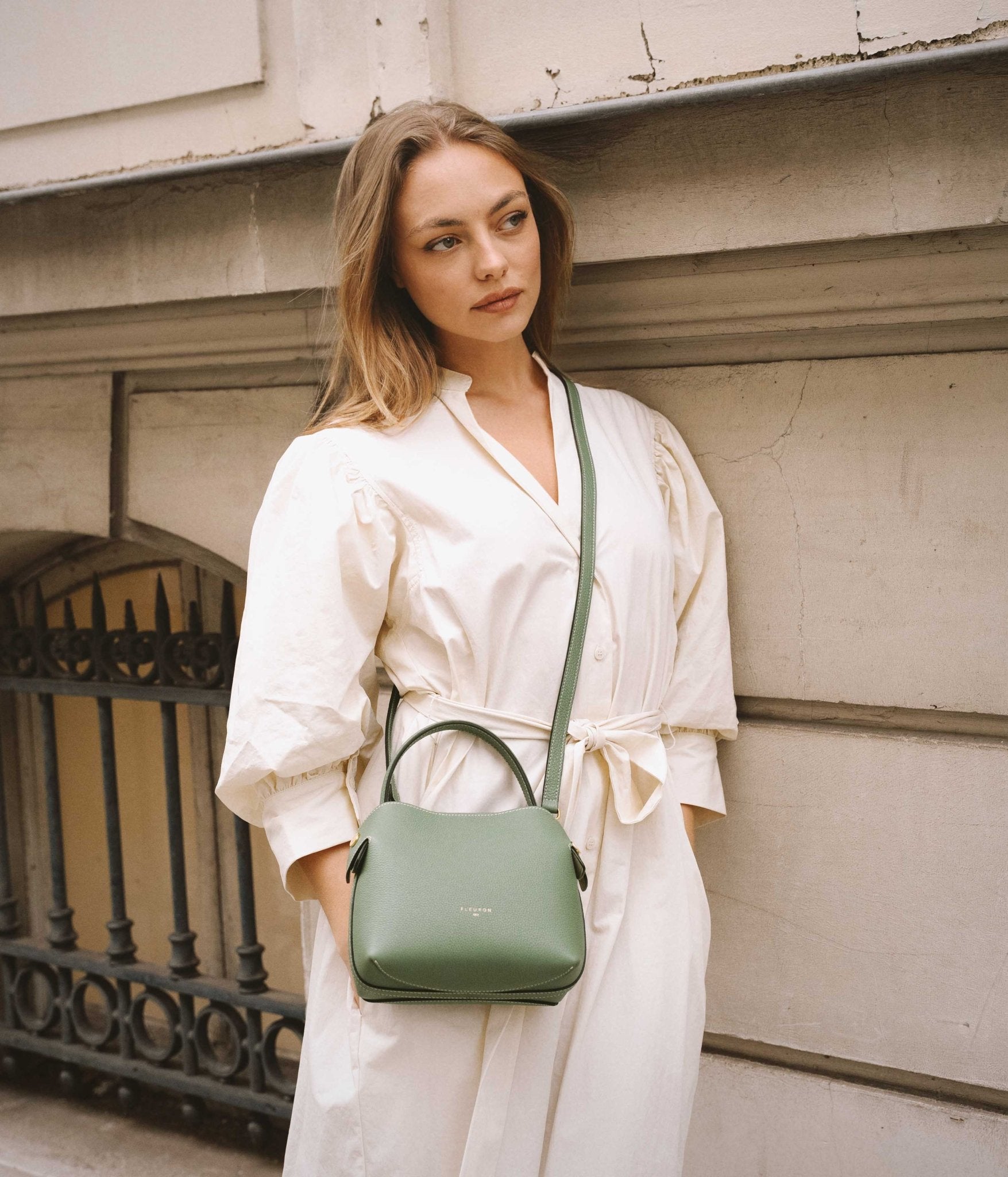 A supple silhouette, an elegant touch with its top handle, the sides fold and unfold like the beating of a wing, for an airy look. The Swann, available in a mini format, has an elongated shoulder strap that leaves your hands free. Be in harmony with nature with our Fleuron bag in almond green color. This soft and relaxing shade is perfect for those looking to add a touch of tranquility to their wardrobe. Made in Italy with grained calf leather, this bag features a beige interior and golden details.