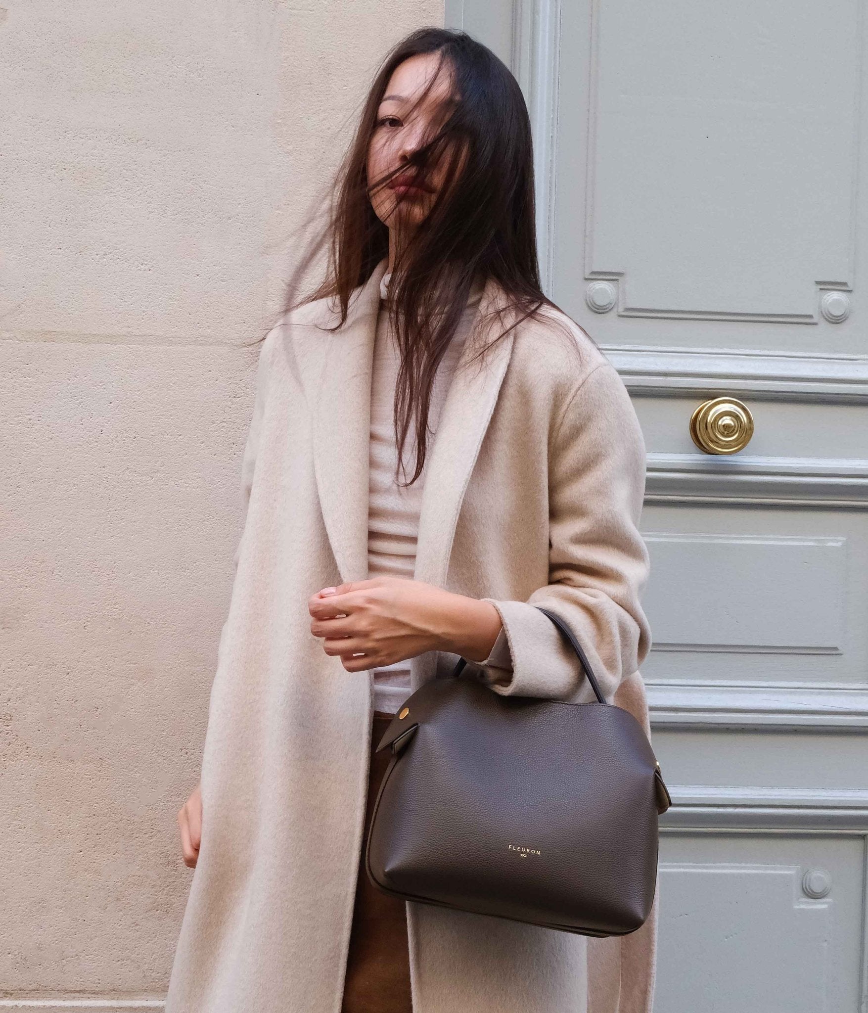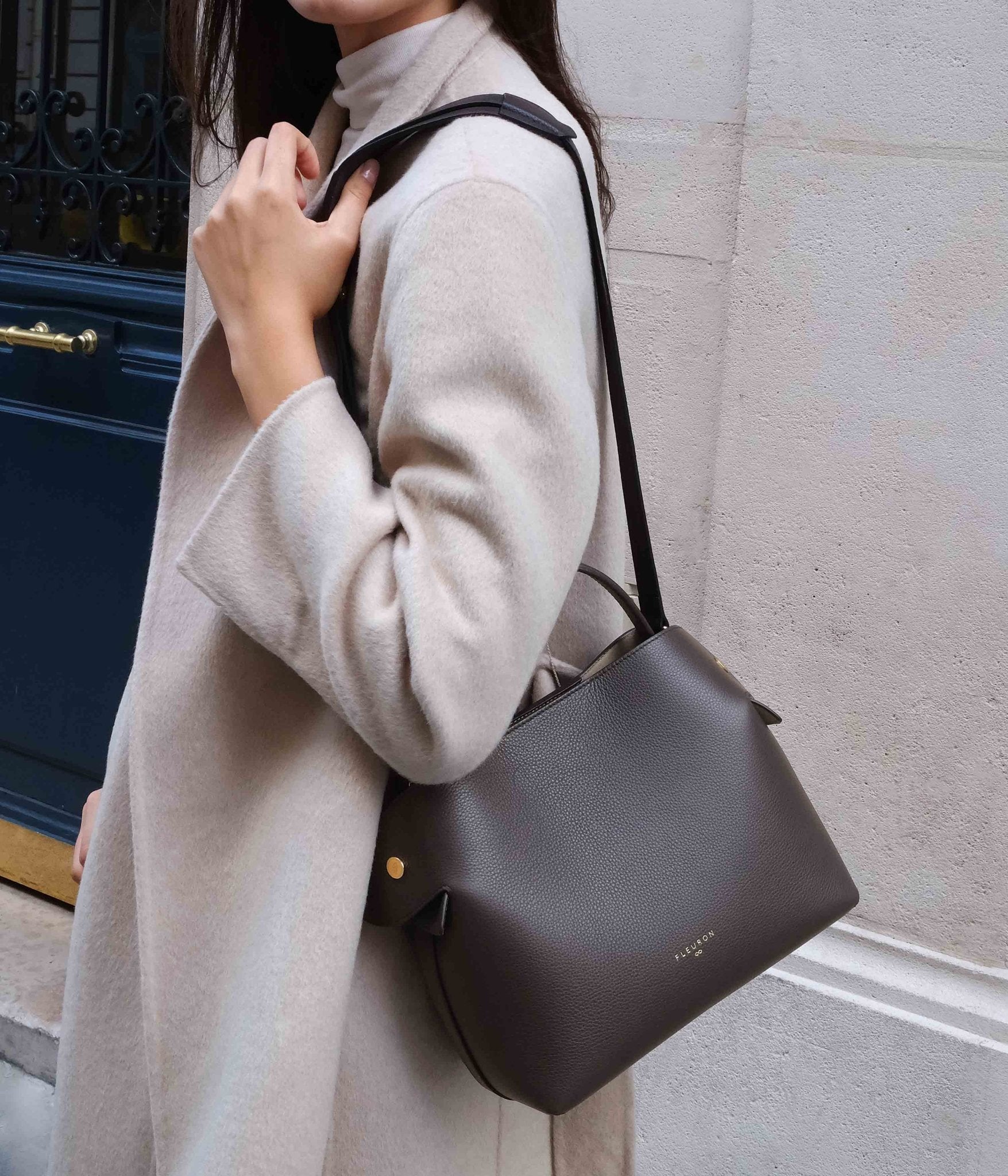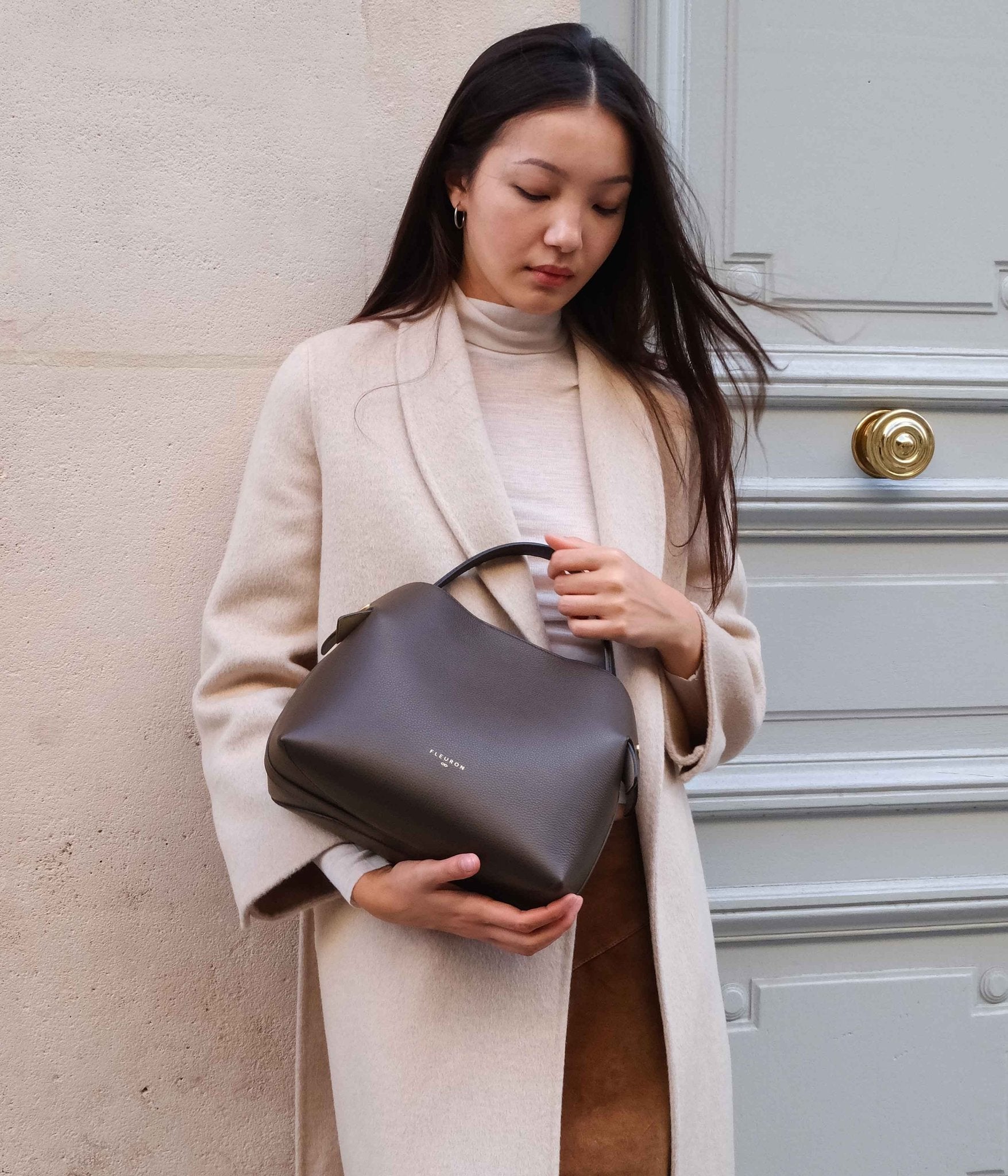 Handcrafted in our Italian workshop from grained calf leather and finished with gold-tone details, the Swann can be carried by hand, worn over the shoulder, or as a crossbody. It closes with a magnetic snap over a beige interior. The sides open with hidden magnets, allowing the detachable strap to pass over the top for shoulder wear, or hang freely when carried by hand.