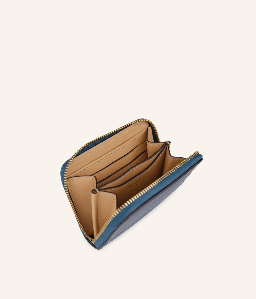 Let yourself be charmed by the softness and freshness of Pacific Blue, a shade inspired by ocean horizons that brings a touch of lightness to your everyday life. Crafted from grained calf leather, this zipped wallet perfectly combines elegance and practicality. Its compact size reveals a cleverly designed interior, ideal for your cards, folded bills, and coins. Made in Italy, it embodies the craftsmanship and finesse of a piece designed to stand the test of time.