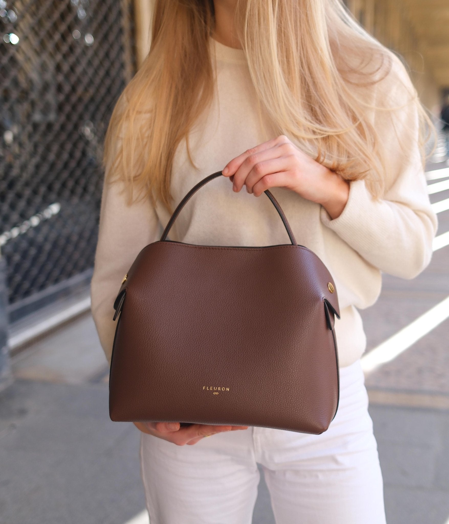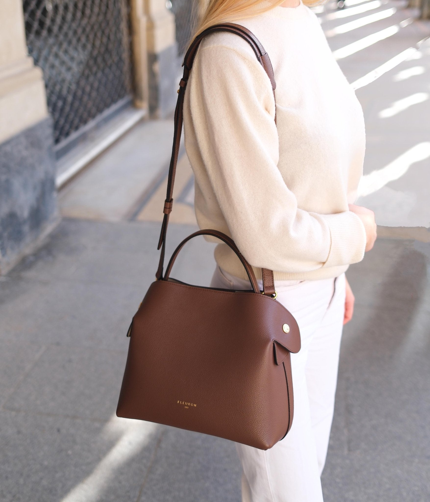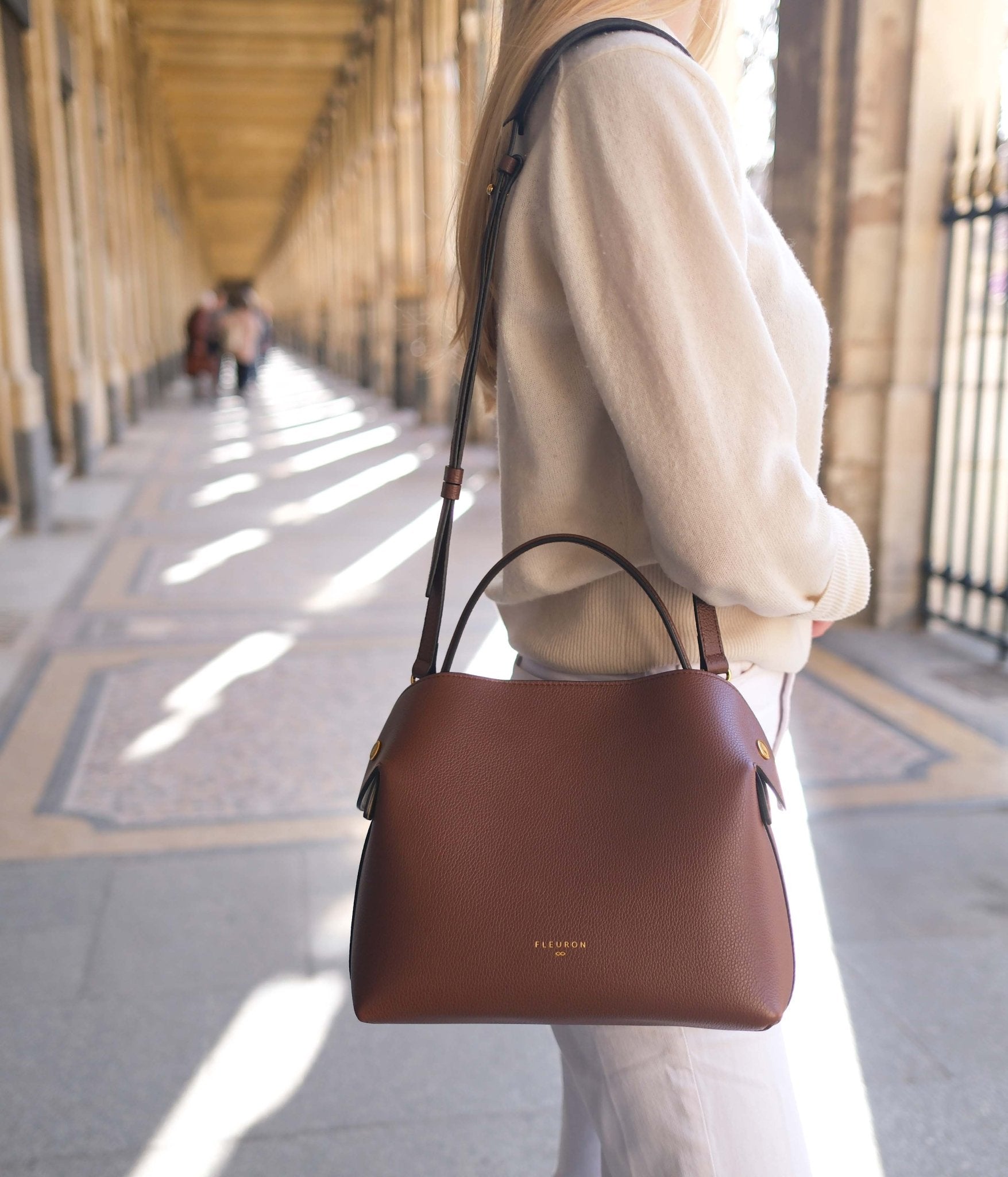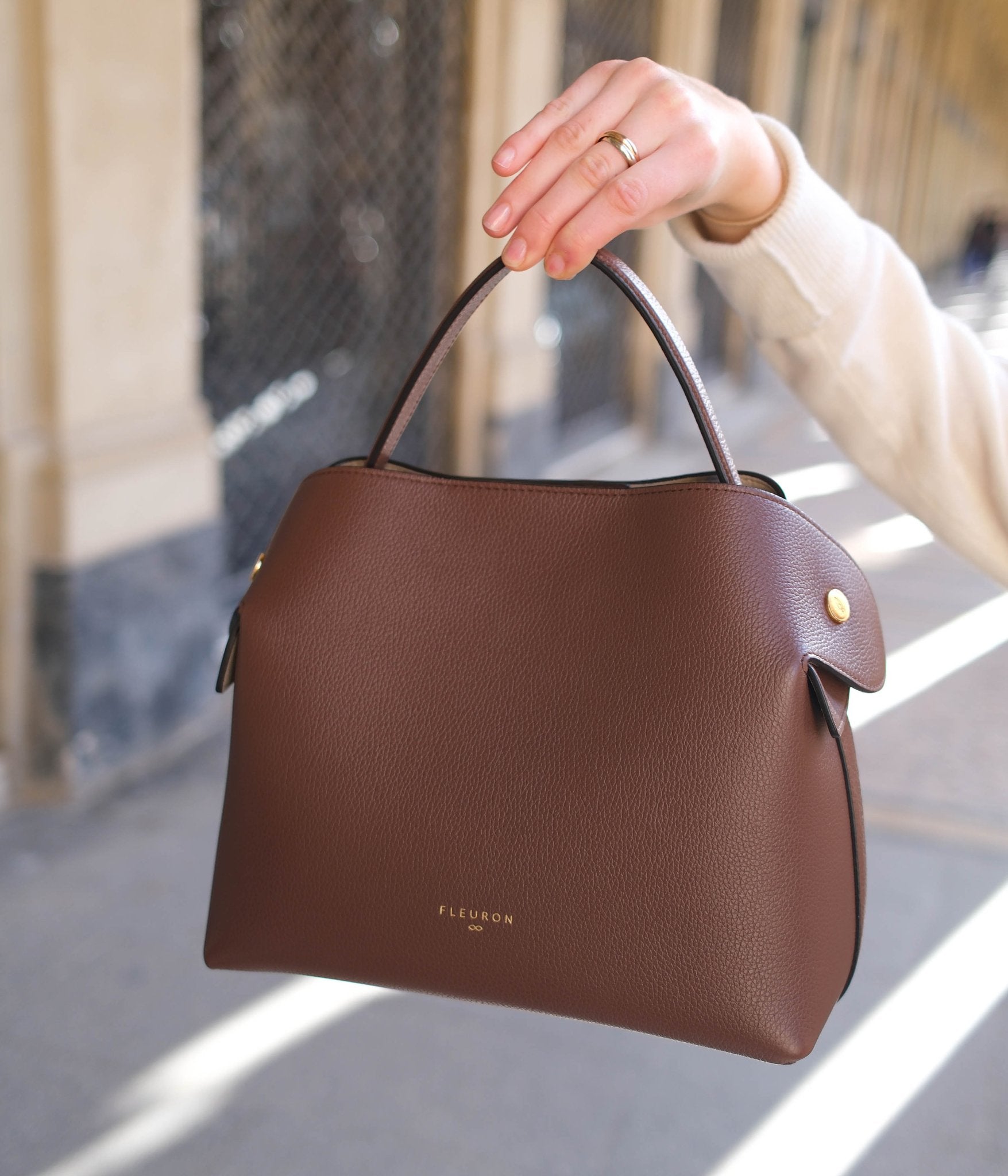 Handcrafted in our Italian atelier from grained calfskin and finished with gold-tone details, the Swann can be carried by hand, over the shoulder, or crossbody. It closes with an automatic magnetic clasp onto a beige interior. The sides unfold with a magnetic system, allowing the removable strap to pass over the top for shoulder wear, or to fall freely when carried by hand.