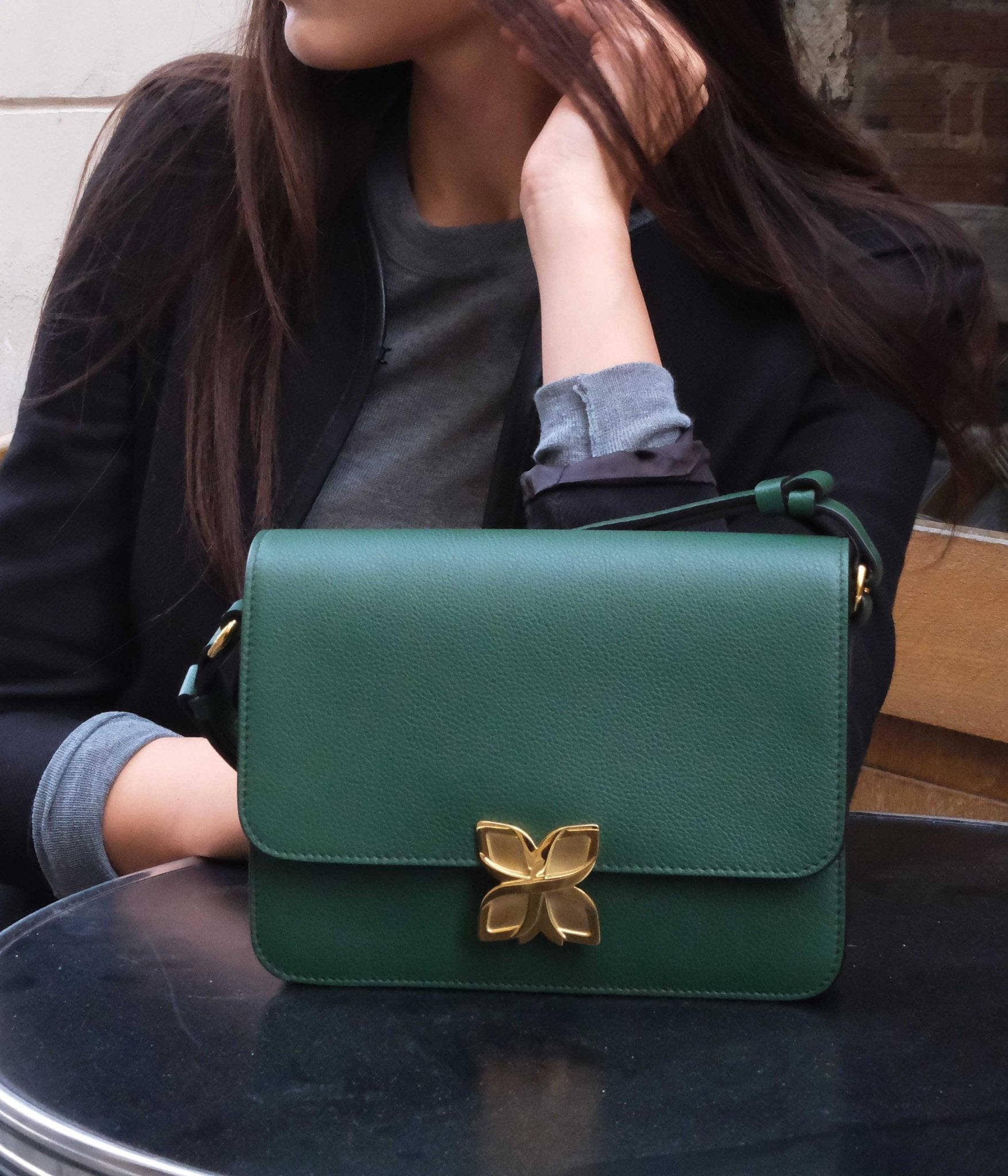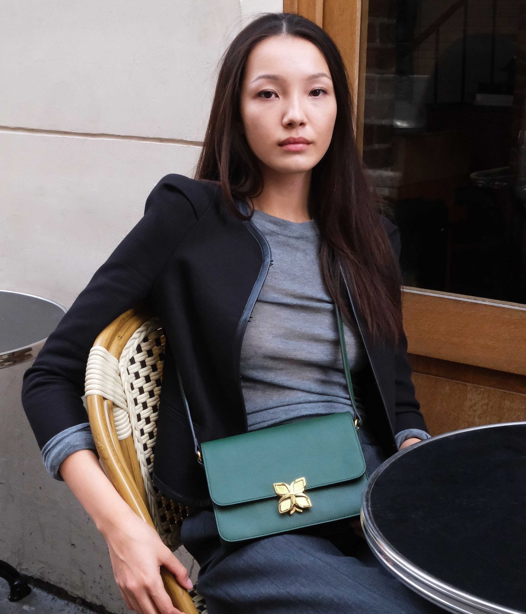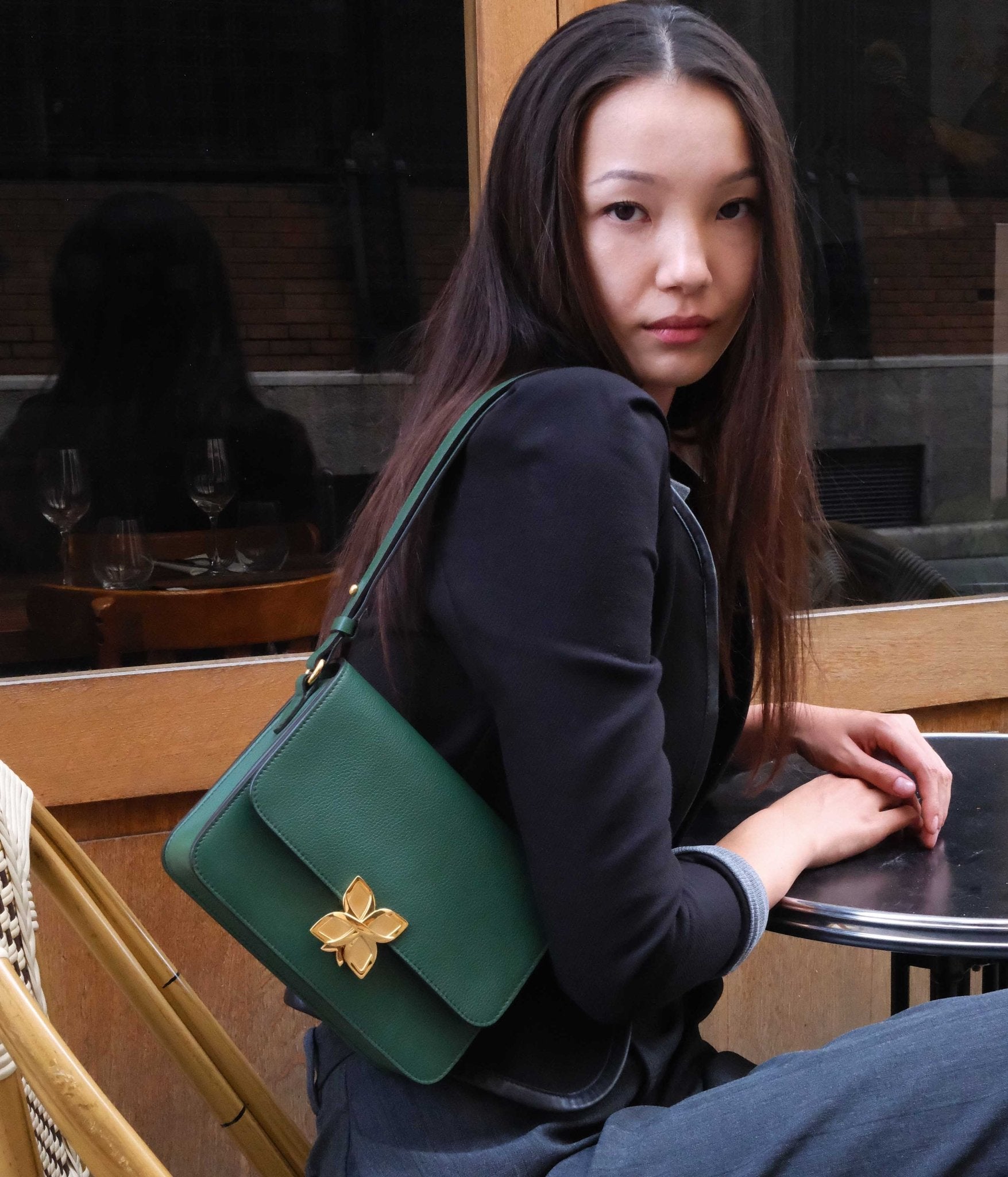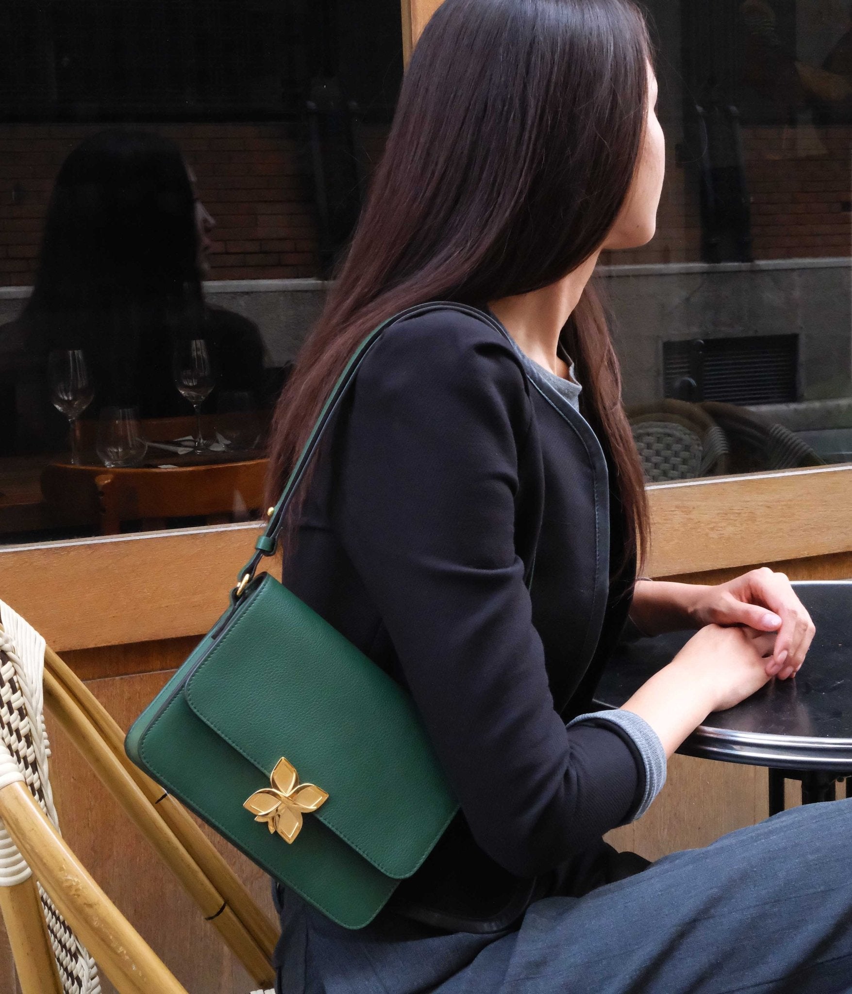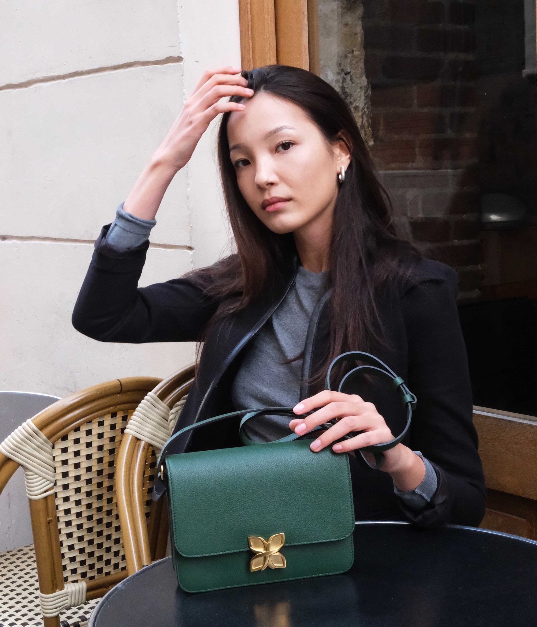 Elevate your style with subtle confidence with Fleuron’s Hortensia bag, expertly crafted from grained calf leather in a deep Vert Sapin shade. Carefully made in our Italian workshop, this bag embodies timeless elegance, blending natural depth with modern structure.